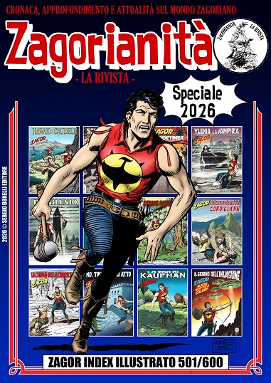 Numero speciale della rivista Zagorianità per l’anno 2026, realizzato sulla scia dei quattro Zagor Index di Paolo Ferriani Editore tra la fine degli anni ’90 e i primi 2000 dei quali è stato replicato un modello di impaginazione pressoché identico (cambia solo il formato, che è 17 x 24, come tutti i numeri di Zagorianità). Il volume inoltre fa seguito allo Zagor Index 401/500 pubblicato come Speciale di Zagorianità nell’inverno del 2024.